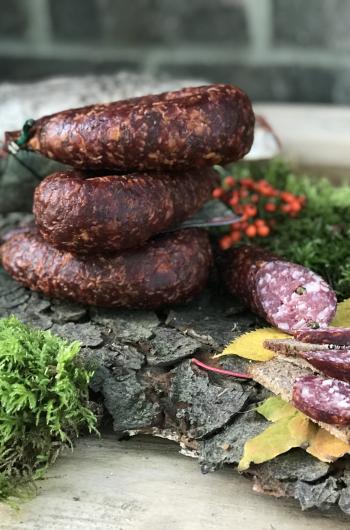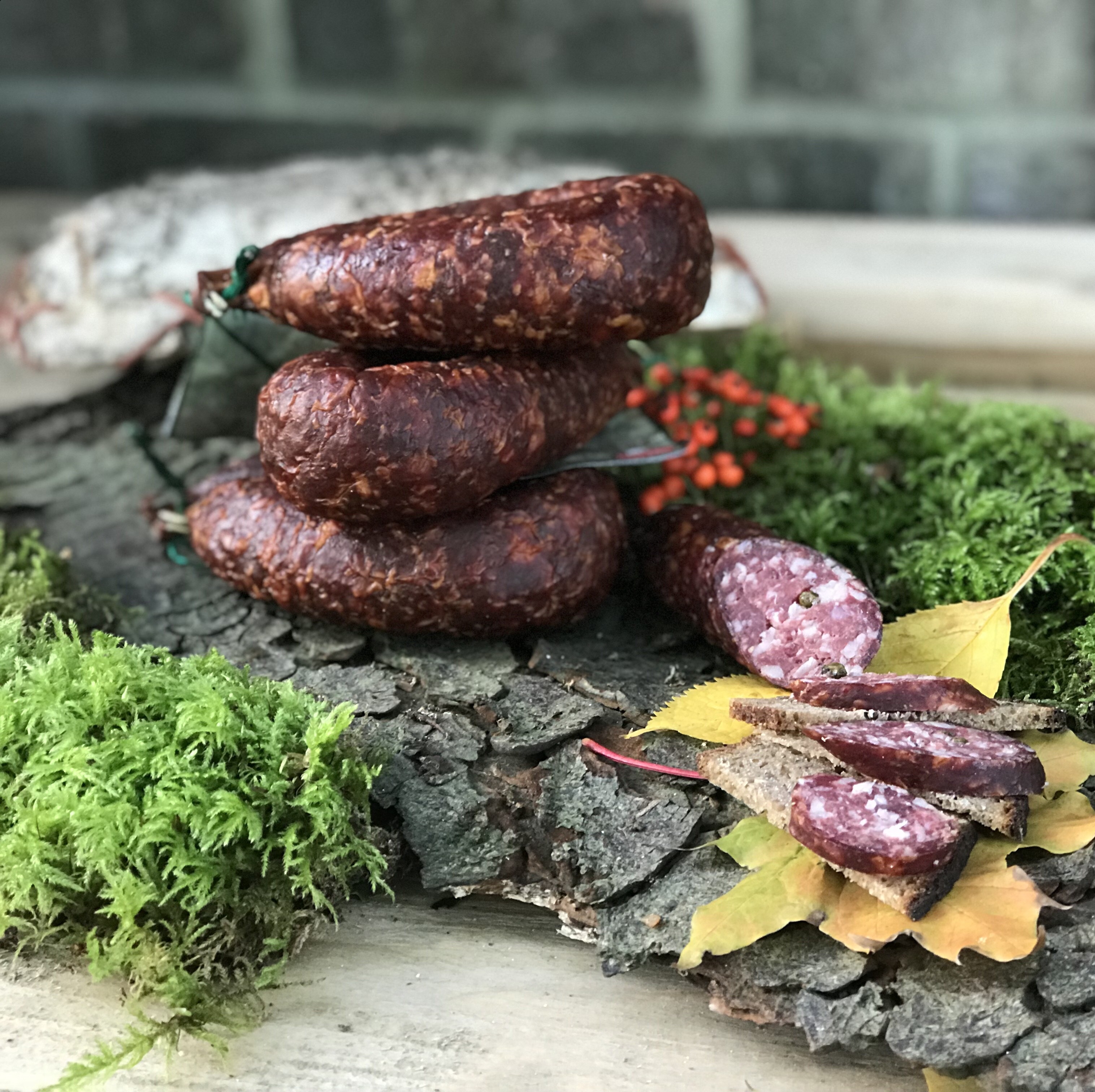 Sudedamosios dalys: danieliaus mėsa 48 %, kiauliena, kiaulienos riebalai, jautiena, druska, rūgštingumą reguliuojanti medžiaga gliukono-delta-laktonas, kvapiosios medžiagos, prieskoniai, antioksidantas natrio askorbatas, cukrus, žalieji pipirai 0,8 %, konservantas natrio nitritas.