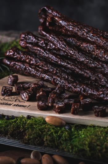 Sudedamosios dalys: kiauliena, danieliaus mėsa 24 %, kiaulienos riebalai, jautiena, kietasis SŪRIS 4,8 % (pasterizuotas PIENAS, druska, raugas, fermentas), druska, prieskoniai (yra GARSTYČIŲ sėklų), aromato ir skonio stipriklis mononatrio glutamatas, antioksidantas natrio eritorbatas, prieskonių ekstraktai, parmezano kvapioji medžiaga (yra PIENO), dekstrozė, dažiklis karminas, startinės kultūros, konservantas natrio nitritas.