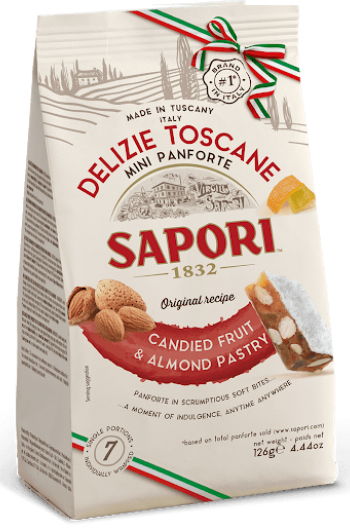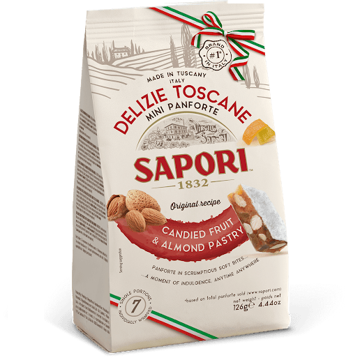 Cukruotų vaisių saldumas susilieja su migdolų traškumu nukeldami Jus į Toskanos delikatesų pasaulį. Šis skanėstas kilęs iš senovės kilmės saldumyno „panforte“, kuris yra Toskanos tradicijos simbolis. Maži, atskirai supakuoti griežinėliai, kuriuos galite pasiimti su savimi gardžiai pertraukai bet kuriuo paros metu. Gryno malonumo akimirka: unikalus ir turtingas skonis, išskirtinis ir autentiškas, tikras ir kruopštus tuo pačiu metu. Minkštųjų cukruotų apelsinų, citrinų žievelių ir melionų, traškių migdolų ir prieskonių mišinys recepte, kuris yra nenugalimas ... Bite after bite!