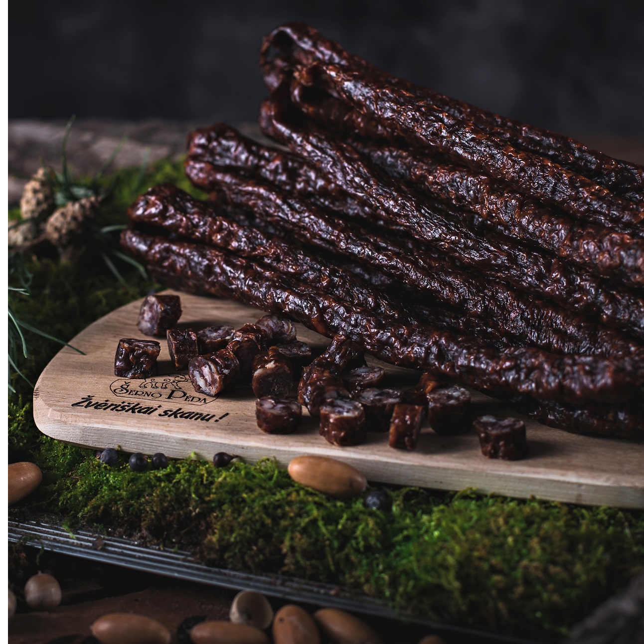 Sudedamosios dalys: kiauliena, danieliaus mėsa 24 %, kiaulienos riebalai, jautiena, kietasis SŪRIS 4,8 % (pasterizuotas PIENAS, druska, raugas, fermentas), druska, prieskoniai (yra GARSTYČIŲ sėklų), aromato ir skonio stipriklis mononatrio glutamatas, antioksidantas natrio eritorbatas, prieskonių ekstraktai, parmezano kvapioji medžiaga (yra PIENO), dekstrozė, dažiklis karminas, startinės kultūros, konservantas natrio nitritas.