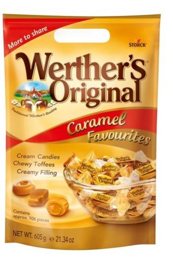 Atraskite „Werther's Original“ ir jo populiarių karamelės konditerijos gaminių pasaulį. Mėgaukitės auksine šilumos ir komforto akimirka. „Werthers Original Caramel Favorites“ - ilgai išliekantis kramtomas irisas ir skanus kreminis įdaras. Kilmės šalis: Vokietija