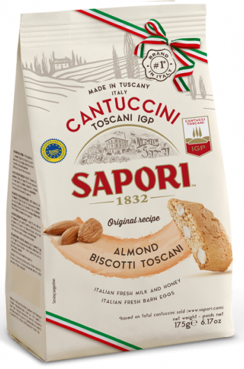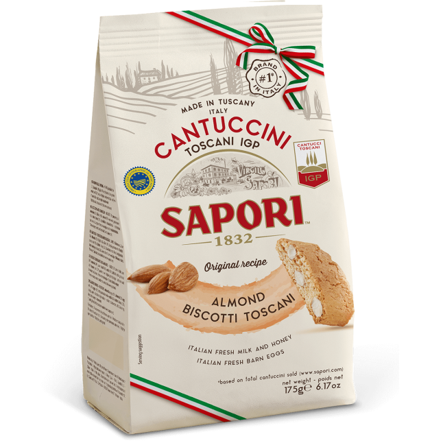 Cantuccini, - tai originalaus šimtmečių tradicijų Toskanos recepto, įstrižai supjaustyti, du kartus kepami, sausainiai. Migdolų gausa kartu su subtilia vanilės ir citrusinių vaisių skonio užuomina - traškus malonumas gomuryje. Kiaušiniai, šviežias pienas, migdolai, cukrus ir medus yra recepto dalys, harmoningai kartu kuriantys nenutrūkstamą ryšį su Toskana